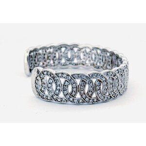 This exquisite estate vintage cuff bracelet is crafted from solid sterling silver 925 and showcases an elegant interlocking circle design encrusted with shimmering clear cubic zirconia (CZ) stones. The design features a continuous pattern of double-linked circles for a dimensional and luxurious look. The open cuff style makes it easy to wear and comfortable on the wrist.