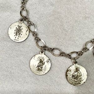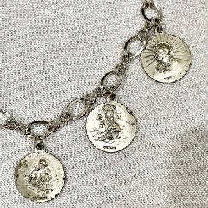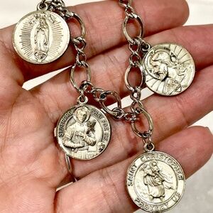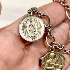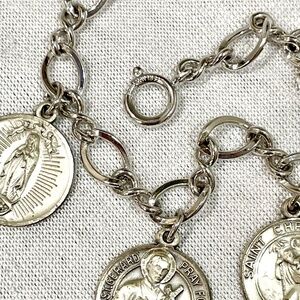 Beautiful vintage religious sterling silver charm bracelet comprised of 5 different sterling silver charms depicting religious icons of the Catholic Church including 2 different images of Mary, St. Gerard, St. Christopher, and Jesus, dangling on a sterling silver bracelet. All marked “sterling” including the bracelet as shown. An elegant way to display your faith, also makes the perfect Christmas gift! I will be sure to ship your bracelet to you asap to ensure you get it in time :)