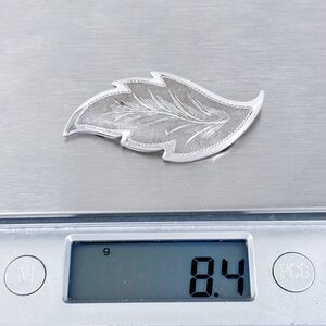 This vintage sterling silver brooch showcases a beautifully engraved feather design within a stylized leaf shape. The intricate detailing and textured finish give it a timeless and elegant look. A perfect accessory for vintage jewelry collectors or those who appreciate nature-inspired designs.