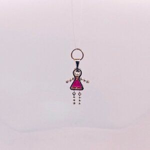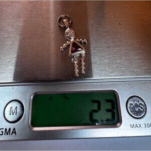 This charming vintage estate pendant features a whimsical girl-shaped design crafted in solid sterling silver 925, as confirmed by the clear “925” hallmark. The pendant showcases a bright, faceted ruby-red triangle gemstone set as the dress and a clear round crystal accent for the head, giving the piece a playful yet elegant look.