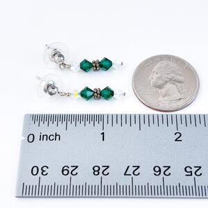 These vintage dangle earrings feature faceted green and clear crystal beads with delicate silver accents for a subtle sparkle. A timeless accessory with a pop of color, perfect for holiday gatherings or adding vintage charm to everyday outfits. Lightweight and classic with stud-style tops for secure wear.