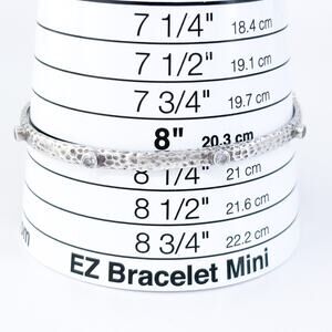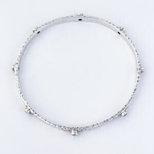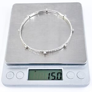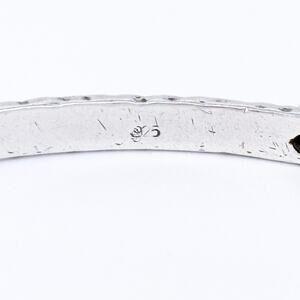 This vintage bangle bracelet features a hammered sterling silver finish accented with bezel-set cubic zirconia stations for subtle sparkle. The sturdy yet elegant design makes it ideal for everyday wear or stacked with other bangles for a bold look. Its timeless appeal adds a refined touch to both casual and formal outfits.