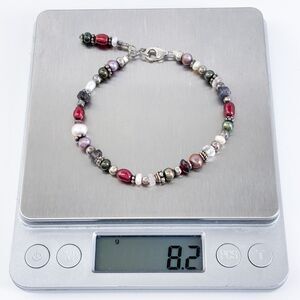 This beautiful vintage sterling silver bracelet features an eclectic mix of colorful pearls, labradorite, and silver accents, creating a unique and bohemian-inspired design. Perfect for adding a touch of natural elegance to any outfit, it’s ideal for casual or formal occasions.