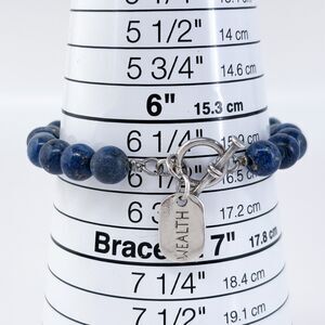 This stunning bracelet features deep blue lapis lazuli beads paired with metallic hematite accents, symbolizing wealth and balance. The sterling silver "WEALTH" charm adds a meaningful touch to this elegant design. Perfect for adding a pop of color and sophistication to your everyday or special occasion wear.