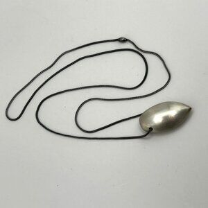 Vintage modernist necklace features a sculptural brushed sterling silver teardrop pendant on a sleek 24-inch snake chain. Both pendant and chain tested positive for sterling silver, with a total weight of 13 grams.