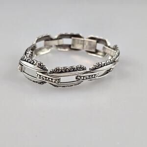 This substantial silver bracelet is both bold and elegant, perfect for stacking with other jewelry or wearing as a statement piece on its own. A great find for vintage jewelry collectors.