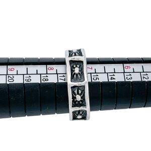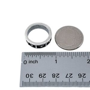 This vintage sterling silver band ring showcases a bold sunburst pattern encircling the band, highlighted with oxidized details for added contrast. Its striking design offers a timeless and versatile appeal, perfect for daily wear or as a statement piece. Ideal for collectors of unique, artisan-crafted jewelry.
