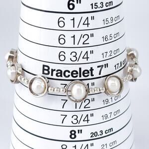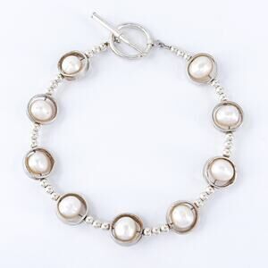 A vintage sterling silver 925 bracelet featuring lustrous pearls and a bent toggle bar closure—simple, stylish, and full of charm.