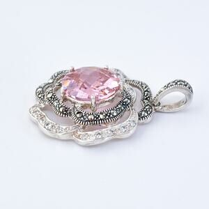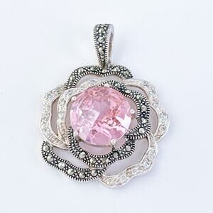 Vintage Sterling Silver 925 Pink Cubic Zirconia Marcasite Flower Pendant