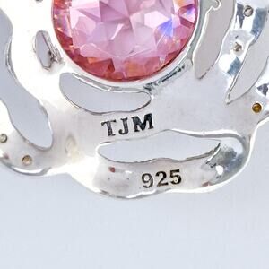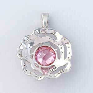 This vintage sterling silver pendant features a dazzling pink cubic zirconia at the center of a layered floral design. The petals are adorned with marcasite and clear CZ stones, adding texture and antique sparkle. A romantic and eye-catching piece perfect for special occasions or adding vintage charm to everyday wear.