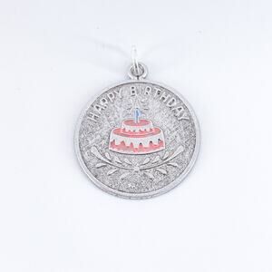 A cheerful vintage charm featuring a birthday cake with pink and blue enamel details and the words “HAPPY BIRTHDAY” engraved above.