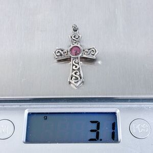 This vintage sterling silver cross pendant features intricate swirling designs and a lovely pink glass cabochon at the center. Its ornate craftsmanship adds a touch of elegance, making it ideal for daily wear or as a meaningful gift. A timeless piece of spiritual-inspired jewelry.