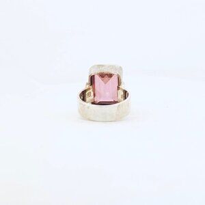 This striking vintage estate ring features a bold emerald-cut pink gemstone set in a solid sterling silver (.925) bezel setting. The stone measures approximately 13mm x 16.9mm, giving it a dramatic, eye-catching presence. The handcrafted silver band is sturdy, smooth, and comfortable, weighing 11.4 grams, providing a substantial, high-quality feel.