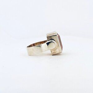 The gemstone displays a beautiful pink hue with excellent clarity, offering vibrant flashes of light through its faceted cut. Its modernist, geometric design gives the ring a unique sculptural quality—perfect for collectors of artisan, retro, or estate sterling jewelry.