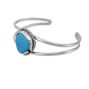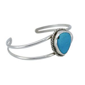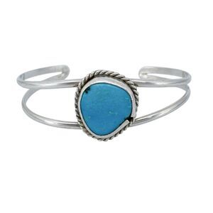 This vintage sterling silver cuff bracelet showcases a stunning turquoise stone framed by a classic twisted rope design. The open cuff style offers both elegance and comfort, perfect for adding a touch of southwestern charm to any outfit. The bold turquoise accent makes this piece ideal for stacking or wearing alone as a statement accessory.