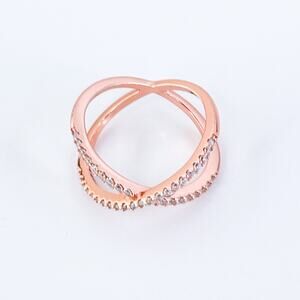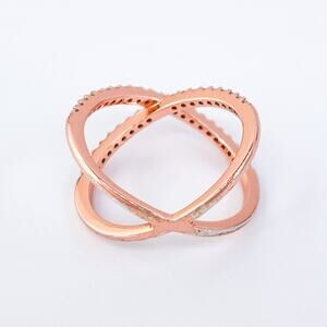 This vintage ring features a sleek crisscross "X" design in rose gold tone sterling silver, accented with a full row of sparkling cubic zirconia. The modern, open silhouette adds a touch of elegance and edge, perfect for stacking or wearing solo. A chic and contemporary piece with timeless shine.