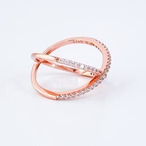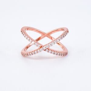 This vintage ring features a sleek crisscross "X" design in rose gold tone sterling silver, accented with a full row of sparkling cubic zirconia. The modern, open silhouette adds a touch of elegance and edge, perfect for stacking or wearing solo. A chic and contemporary piece with timeless shine.