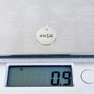This minimalist sterling silver charm features the word "swim" hand-stamped in a casual, rustic font. Its lightweight design makes it perfect for adding to a charm bracelet or wearing as a pendant. A great gift for swimmers, beach lovers, or those who embrace a go-with-the-flow lifestyle.
