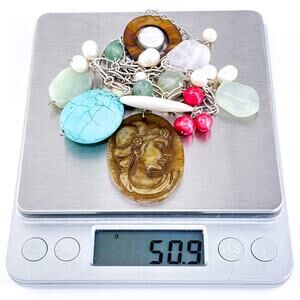 This vibrant vintage charm necklace is a whimsical statement piece featuring an eclectic mix of pearls, natural stones, and a carved cameo centerpiece. Its playful design and rich textures evoke an artisan, one-of-a-kind charm ideal for creative wardrobes. A standout accessory for art shows, brunch outings, or collectors of unique vintage jewelry.