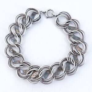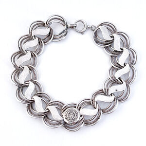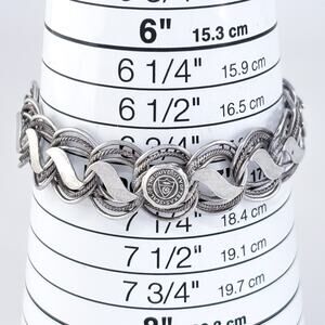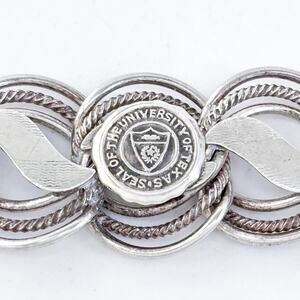 This vintage sterling silver bracelet features a bold, textured link design and a central emblem showcasing the official seal of the University of the State of Texas. Crafted with sturdy circular and wave-motif links, it offers both presence and pride for alumni or fans. A unique piece of collegiate memorabilia, perfect for casual wear or spirited events.