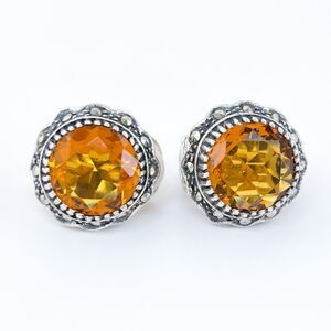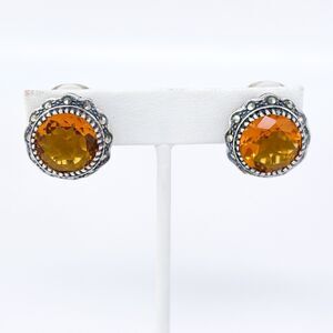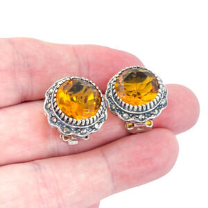 These vintage sterling silver earrings feature vibrant faceted glass stones framed by marcasite accents in an ornate setting. The warm amber hue contrasts beautifully with the oxidized silver, giving them a timeless antique appeal. Perfect for vintage lovers and elegant evening wear.