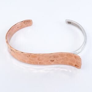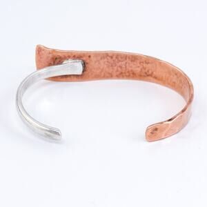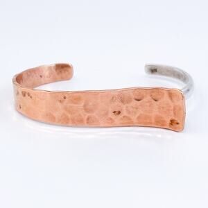 This vintage cuff bracelet combines sterling silver and copper in a striking two-tone design. The copper overlay is hammered for a rustic, handcrafted look, creating a bold yet earthy style statement.