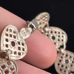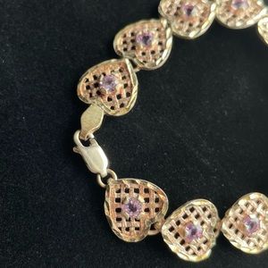Vintage Sterling Silver 925 hallmarked heart link bracelet with amethyst purple stone in the center of each heart.