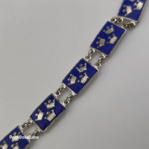 This vintage sterling silver link bracelet features beautiful royal blue enamel panels, each adorned with intricate crown designs. The craftsmanship showcases the elegance and charm of a bygone era, making this bracelet a true statement piece. The bracelet measures 6 inches and is secured with a sturdy clasp, perfect for adding a touch of vintage flair to any outfit.