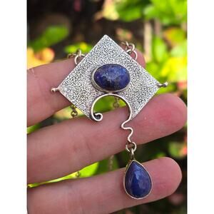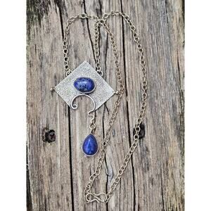 This artsy necklace features a modernist design with a textured sterling silver geometrical pendant and an oval bezel set blue lapis lazuli on top and a bezel set teardrop blue lapis lazuli that dangles from the bottom. See photos for a better description.