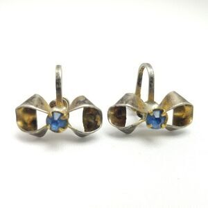 Vintage Sterling Silver Blue Rhinestone Bow Shape Clip On Screw Back Earrings