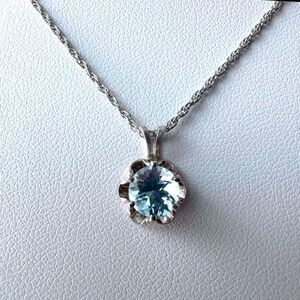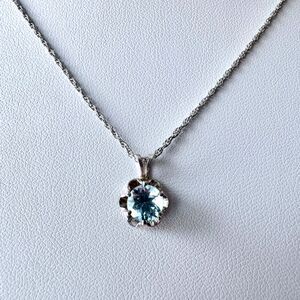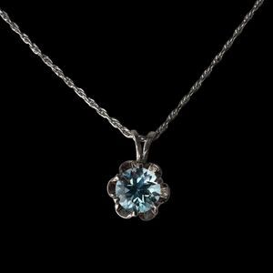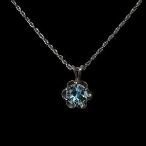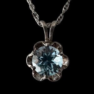 This is a vintage estate blue Topaz and 925 sterling silver pendant and rope chain necklace. It features a beautiful 6mm round solitaire gemstone in a 6 prong, simple setting with a scalloped edge. It comes with an 18 inch long dainty twisted rope chain necklace which is 1mm thick. Blue Topaz is a December birthstone.