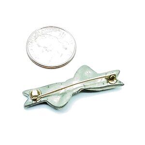 This vintage brooch brings a touch of elegance and charm, with its intricate bow design adorned with marcasite stones. Measuring approximately 2 inches in length, it offers timeless appeal and sophistication, making it a versatile accessory to complement both casual and formal attire.