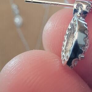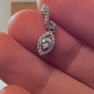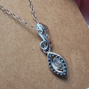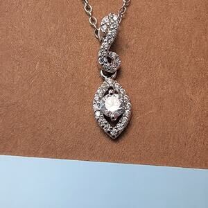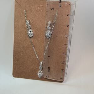 This vintage sterling silver jewelry set includes a beautifully designed necklace and matching earrings, perfect for adding timeless elegance to any occasion. The pieces feature marquise-shaped cubic zirconia stones surrounded by delicate silver detailing, giving the pieces a refined, vintage-inspired look. The pendant necklace features a fine, durable silver chain and a cascading marquise pendant that complements the sparkling stones. The earrings mirror the necklace’s design with matching cubic zirconia stones set in silver, creating a cohesive and sophisticated set. Crafted from high-quality sterling silver and stamped for authenticity, this set is a perfect choice for formal events, weddings, or as a luxurious gift. The items show minimal signs of wear, with the silver retaining a pristine shine, highlighting the craftsmanship. Whether you're enhancing your jewelry collection or looking for a special gift, this set combines vintage charm with modern elegance.