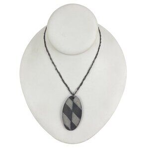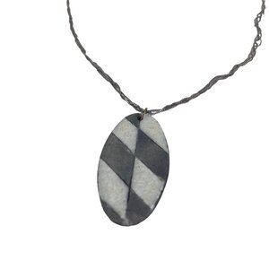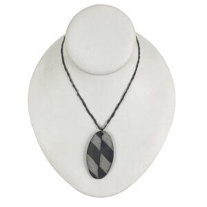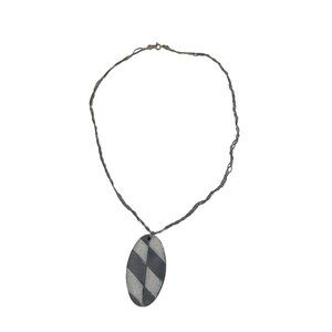 This exquisite vintage necklace features an 18-inch sterling silver chain, elegantly twisted into three strands, and a distinct ceramic pendant. The pendant showcases a striking harlequin pattern, embodying an air of refined sophistication. A timeless accessory, it enhances both casual and formal outfits, making it a cherished addition to any jewelry collection.