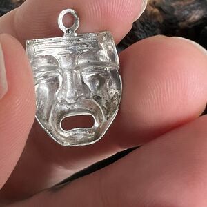 Medium sized thespian mask sterling silver charm. I have not polished the charm as you may like the silver patina and I wanted you to be able to decide the finish. No jump ring for this charm.