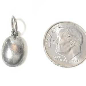This is a sterling silver 3D charm representation of a coffee bean--our favorite morning starter. This charm is fully and realistically modeled and measures a total of 3/4", including bale. The bale is soldered closed and has multiple stamps--"925", a hard-to-read maker's mark, and another. Very good vintage condition.