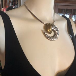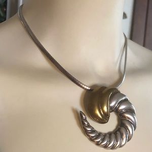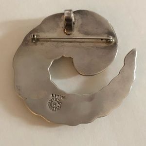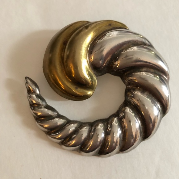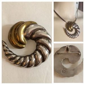 Beautiful Taxco Mexico Sterling Silver 925 LATON Modernist Cornucopia Silver Swirl and brassy gold design Pendant/Brooch. Measures a tad over 2-1/4”. Shown as a pendant necklace on an Omega chain (not included). In excellent preowned condition showing normal vintage wear and patina on the top gold overlay section (see magnified pic). A great piece t add to your collection!Smoke-free home. Vintage is beautiful but not perfect. Please don’t expect new.