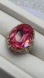 This exquisite ring showcases a large, oval-cut pink color crystal by Swarovski , set in a beautifully crafted silver band. The intricate metalwork adds a vintage charm, enhancing the ring's elegance. The vibrant green crystal reflecting light with stunning clarity and depth.