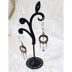 These vintage sterling silver chandelier aurora borealis earrings are a stunning accessory to elevate your style. Crafted from silver and adorned with sparkling crystal accents, they add elegance to any outfit. Their intricate design and dangling crystals catch the light beautifully, making them an eye-catching addition to your jewelry collection.