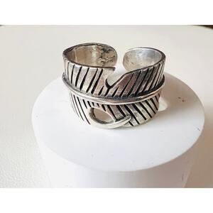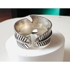 Vintage sterling silver wrap ring featuring a detailed feather design with oxidized accents. The band is adjustable, starting at size 7.75 Marked 925 inside the band and tested sterling silver.