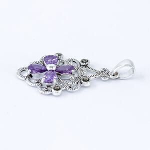 Vintage Sterling Silver Filigree Flower Marcasite Purple Cubic Zirconia Pendant