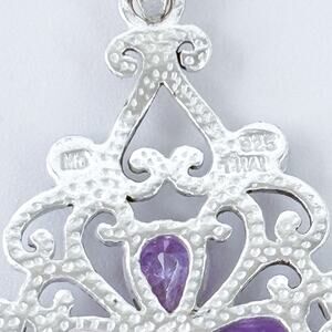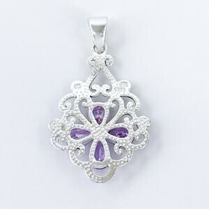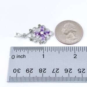 This beautifully detailed sterling silver pendant features a delicate filigree design centered around a flower motif with four faceted purple cubic zirconia stones and sparkling marcasite accents.