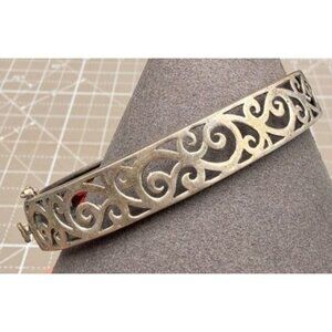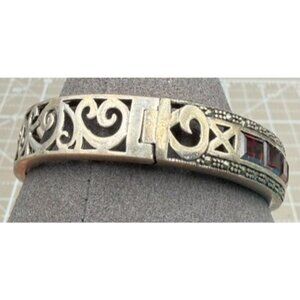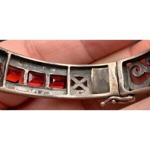Vintage Sterling Silver Filigree Hinged Bracelet 925 Red Glass Stones Art Deco S