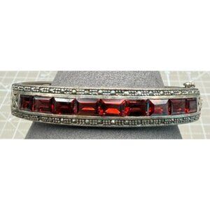 Picturedd is a sterling silver hinged bracelet with ornate filigree design and deep red glass stones with marcasites.