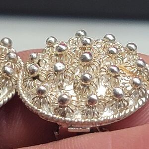 These vintage sterling silver flower clip-on earrings are a beautiful addition to any jewelry collection. The intricate design of the flower and the clip-on closure make them perfect for those who want to add a touch of elegance to any outfit. The earrings are made of high-quality materials and are sure to last for years to come. They are a great gift for someone special or a treat for yourself.