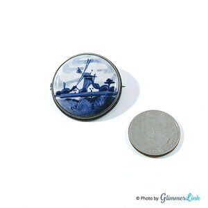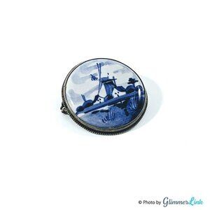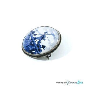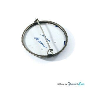 Vintage Sterling Silver GB5 Hand painted Holland Delft Porcelain Round Brooch