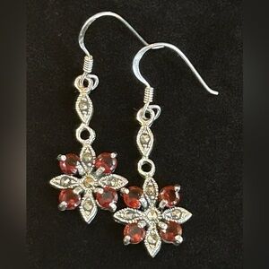 Four facet cut, prong set garnets set in sterling silver complimented by by marcasites.