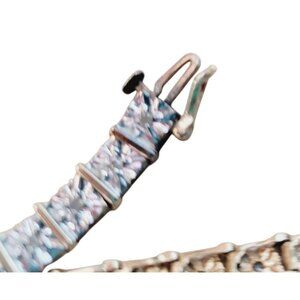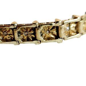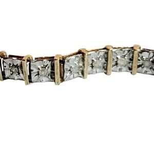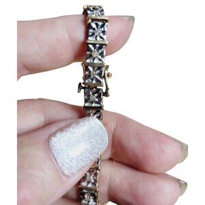 This vintage tennis bracelet is a timeless piece from a bygone era, showcasing a sophisticated combination of sterling silver and gold vermeil. Adorned with sparkling cubic zirconia, it offers a luxurious look and feel. The bracelet is a beautiful example of vintage jewelry design, exuding elegance and class.