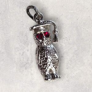 Celebrate wisdom and achievement with this charming sterling silver graduation duo! This vintage set includes two classic charms a wise owl wearing a graduation cap with sparkling red gemstone eyes, and a diploma scroll marked DIPLOMA with a red rhinestone seal. Together, they make a meaningful pair that perfectly symbolizes both knowledge and success.