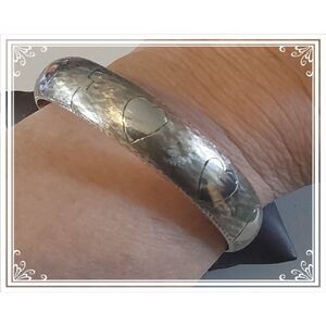 Textured vintage 925 sterling silver heart etched bangle bracelet with safety chain. In great condition...there is a small dent shown in pics 3 and 6 which is barely noticeable when wearing. Itmis stampedm925 for authenticity. Will fit up to a 8" wrist and is 3/8" in width.